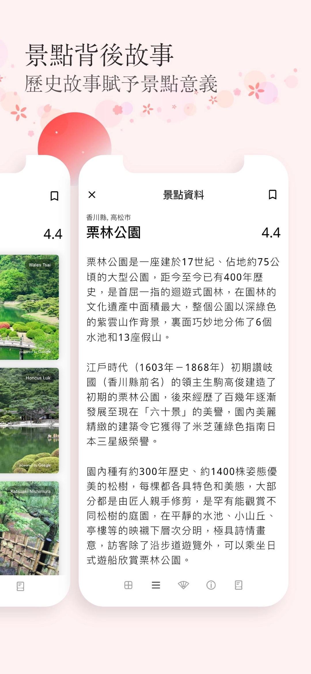 "It's Japan" is an in-depth tour guide app in Japan. We will find the most suitable destination among more than 2,500 attractions according to your preferences, and reveal the hidden stories behind each scene and object for you. From now on,